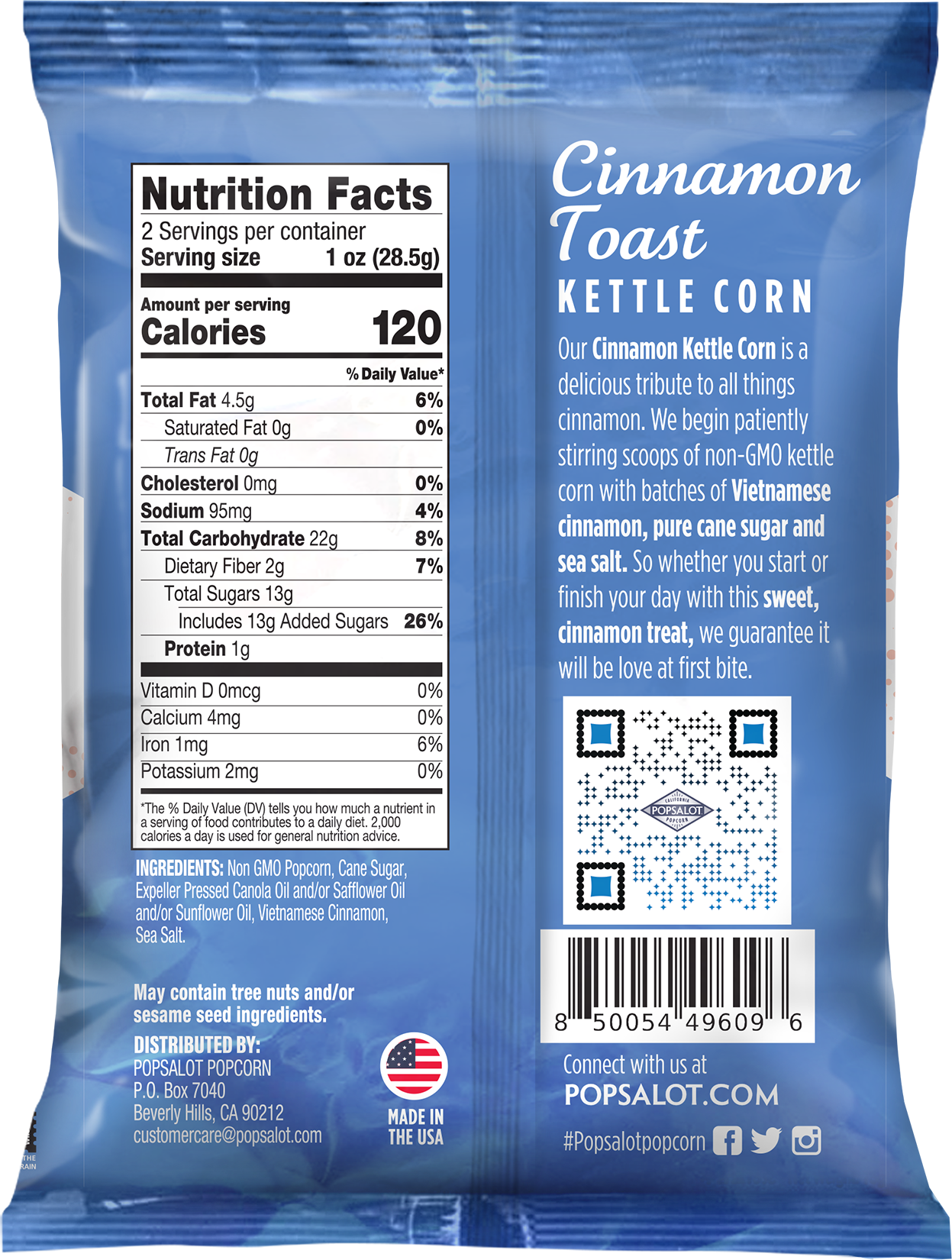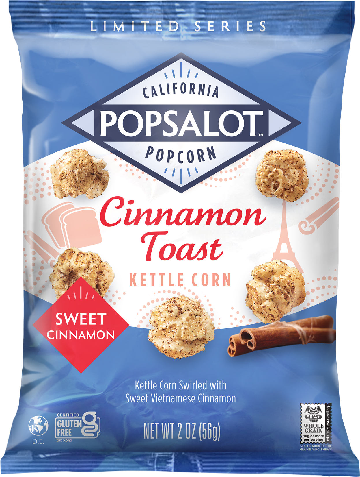 Popsalot's artisanal kettle corn coated in rich cinnamon sugar for a nostalgic, sweet toast-like crunch in every bite.